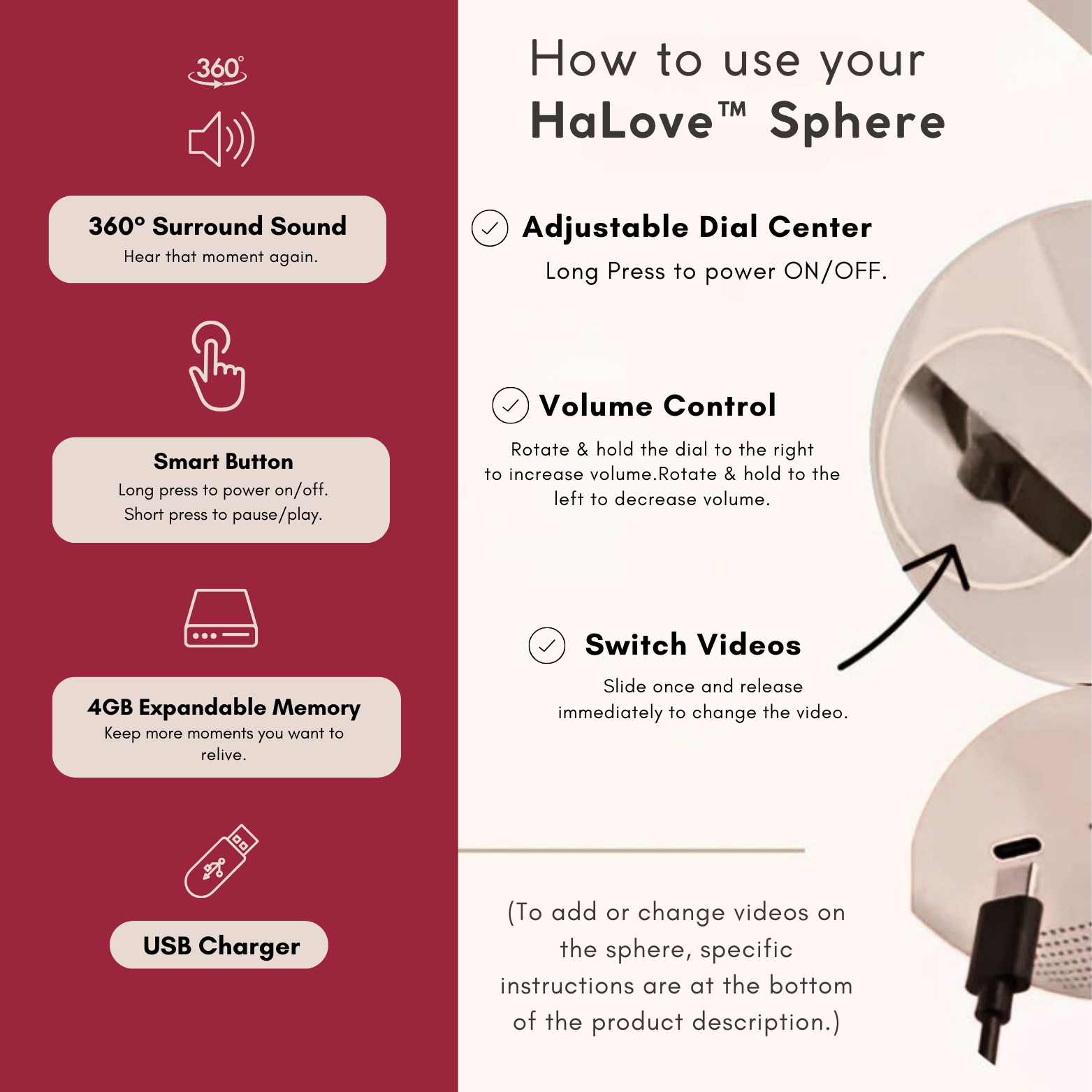 Halove Sphere™ is a beautifully crafted memory device that stores and plays your most cherished videos with a single press.